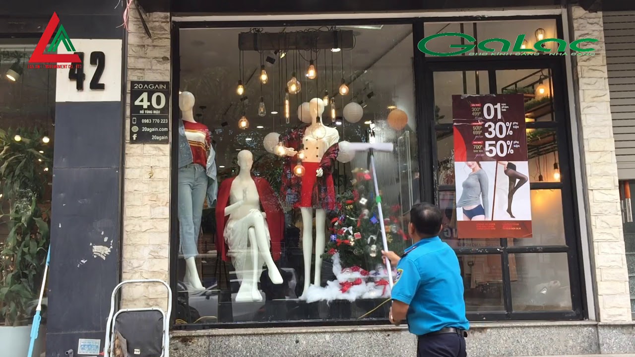 Tại 1 cửa hàng thời trang trên đường Hồ Tùng Mậu, Cầu Giấy, Hà Nội. Bác bảo vệ ở đó kiêm nhiệm thêm nhiệm vụ làm sạch cửa kính cửa hàng.