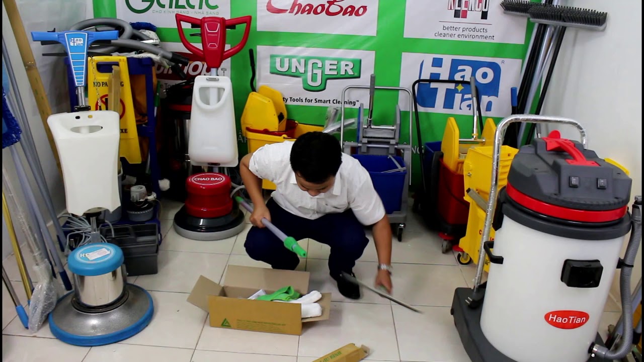 Gắn đầu bộ bông chà và đầu tay gạt vào cây nối dài rồi thực hiện 2 bước như trên.